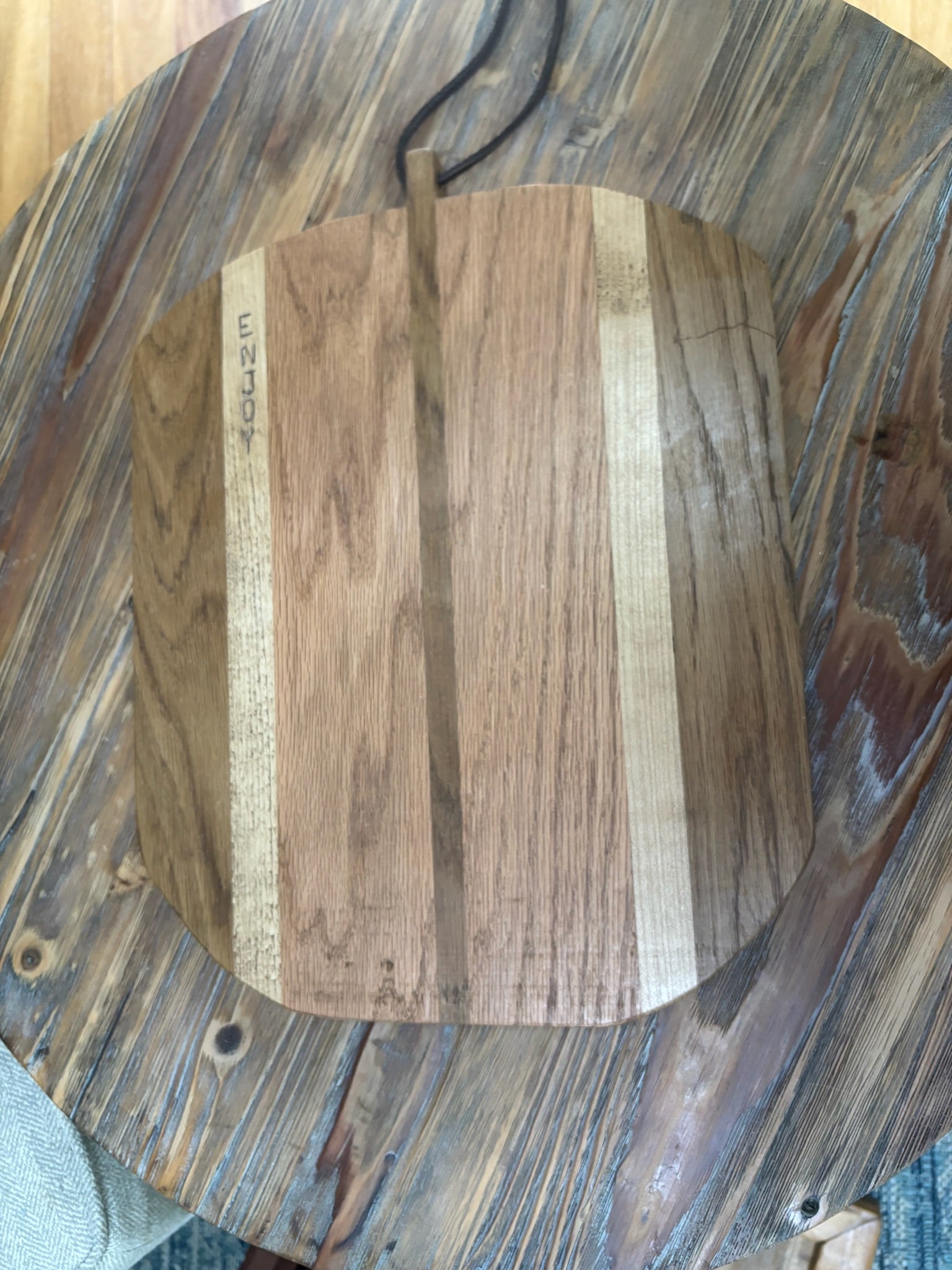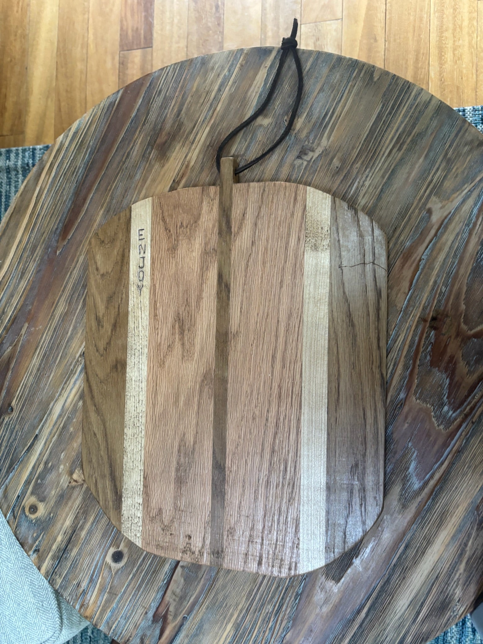 This is food safe board is 14"x12" and has a leather strap for easy display.
